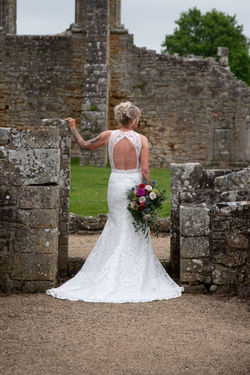 Laced column dress with a high neck and subtle slit down the front, the back has a cathedral-shaped space buttoning up with three buttons at the top in sizes: