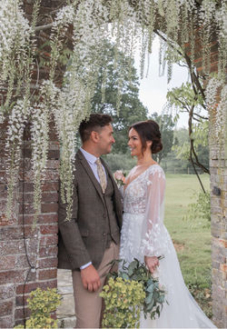 Floaty boho vibe with the bolero sleeves, low back and leaves as opposed to flowers in the lace, perfect for that woodland wedding in sizes: 2 to 34.